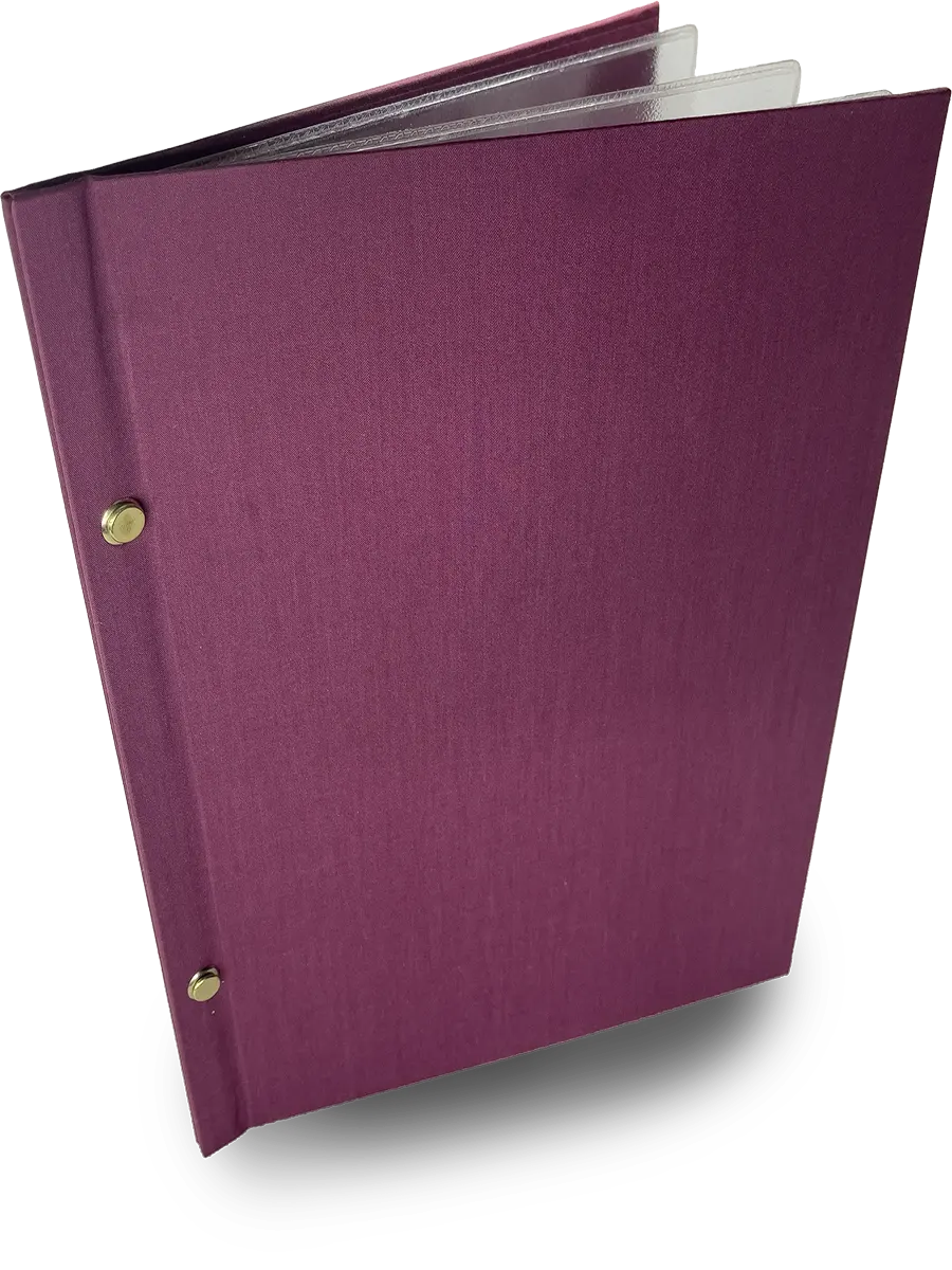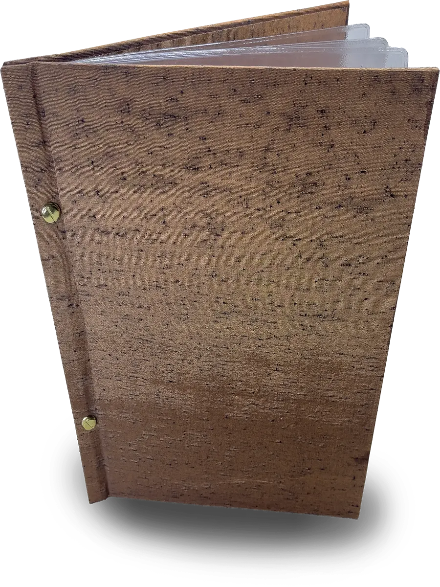 Our custom menus are one-of-a-kind and can be tailored to the buyer’s preferences. For room service menus, we intentionally make them thick and sturdy to prevent them from being taken away, but we can also make them small and thin based on the buyer’s needs. The materials used for the inside and outside of the menu can be mixed and matched to provide a wide range of options. We recommend using a four-hole metal clip for quick and easy replacement of the pages during events.