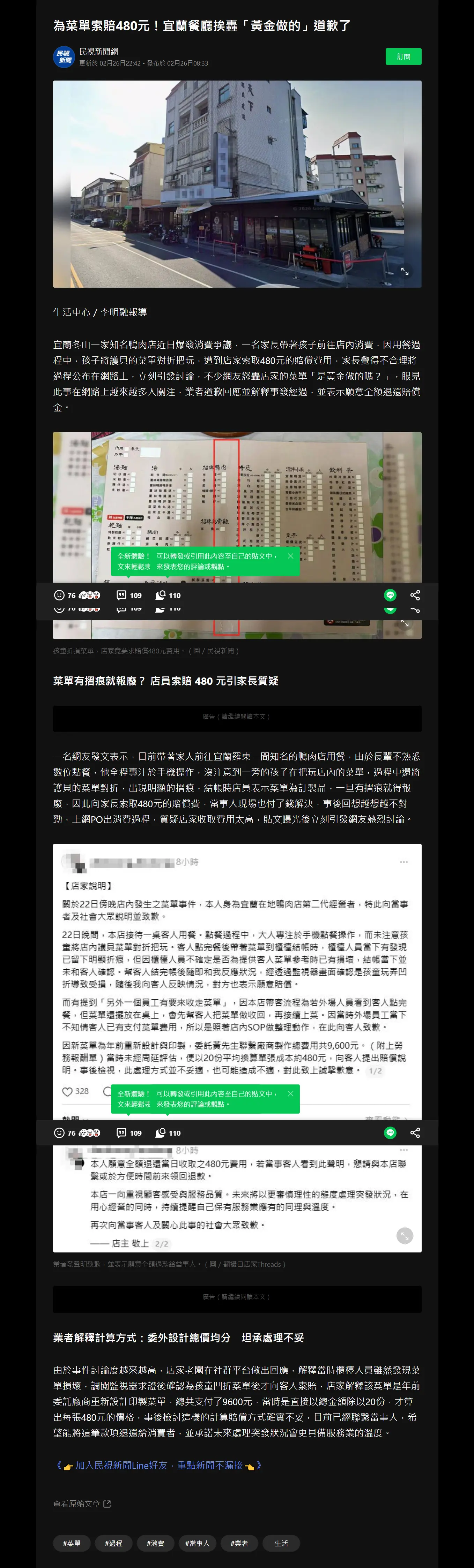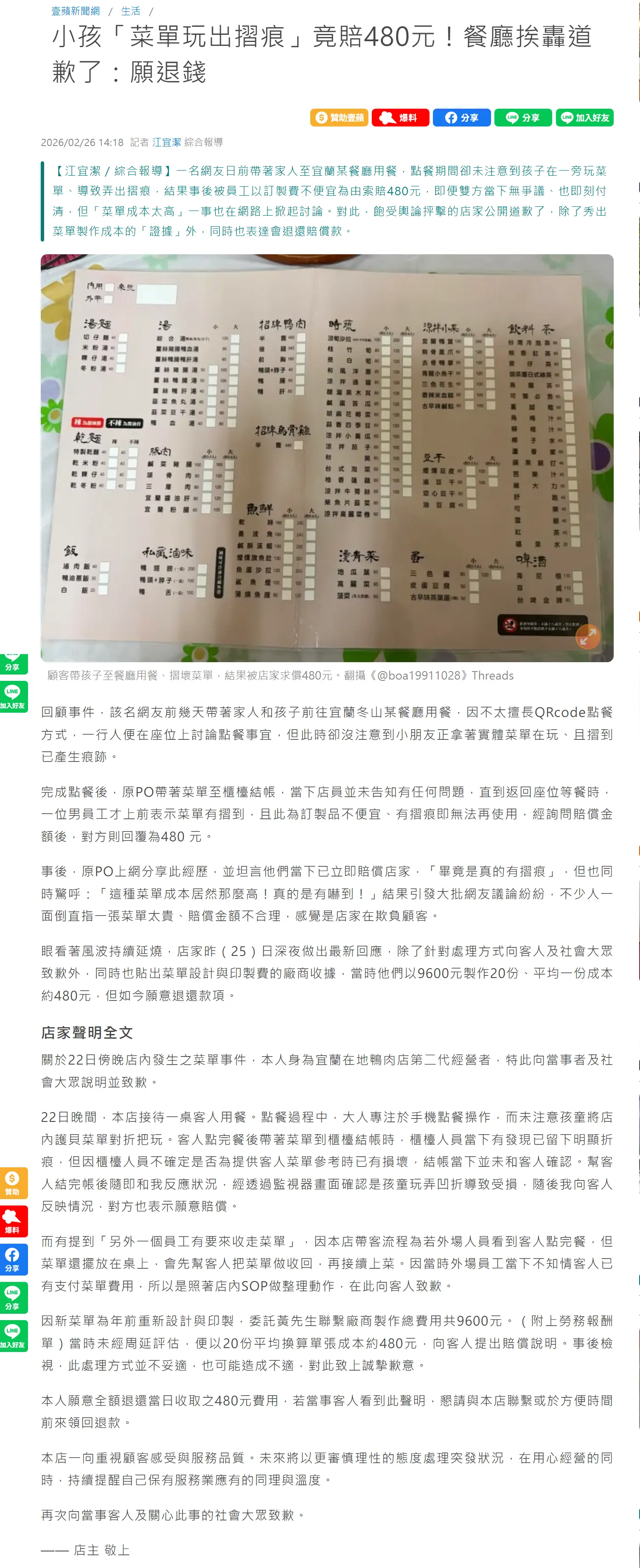 A well-known duck specialty restaurant in Dongshan, Yilan, recently became the center of a consumer dispute. A parent visited the restaurant with their child, and during the meal, the child bent and folded a laminated menu while playing with it. The restaurant subsequently requested TWD 480 in compensation.